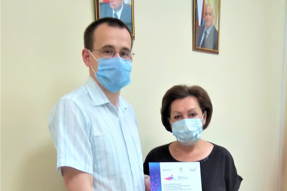 Уполномоченный по правам ребенка по Костромской области Татьяна Евгеньевна Быстрякова вручила президенту благотворительного фонда «Будущее Сейчас» Константину Ситникову диплом Всероссийского конкурса Уполномоченного при Президенте Российской Федерации по правам ребенка «Вектор детства».